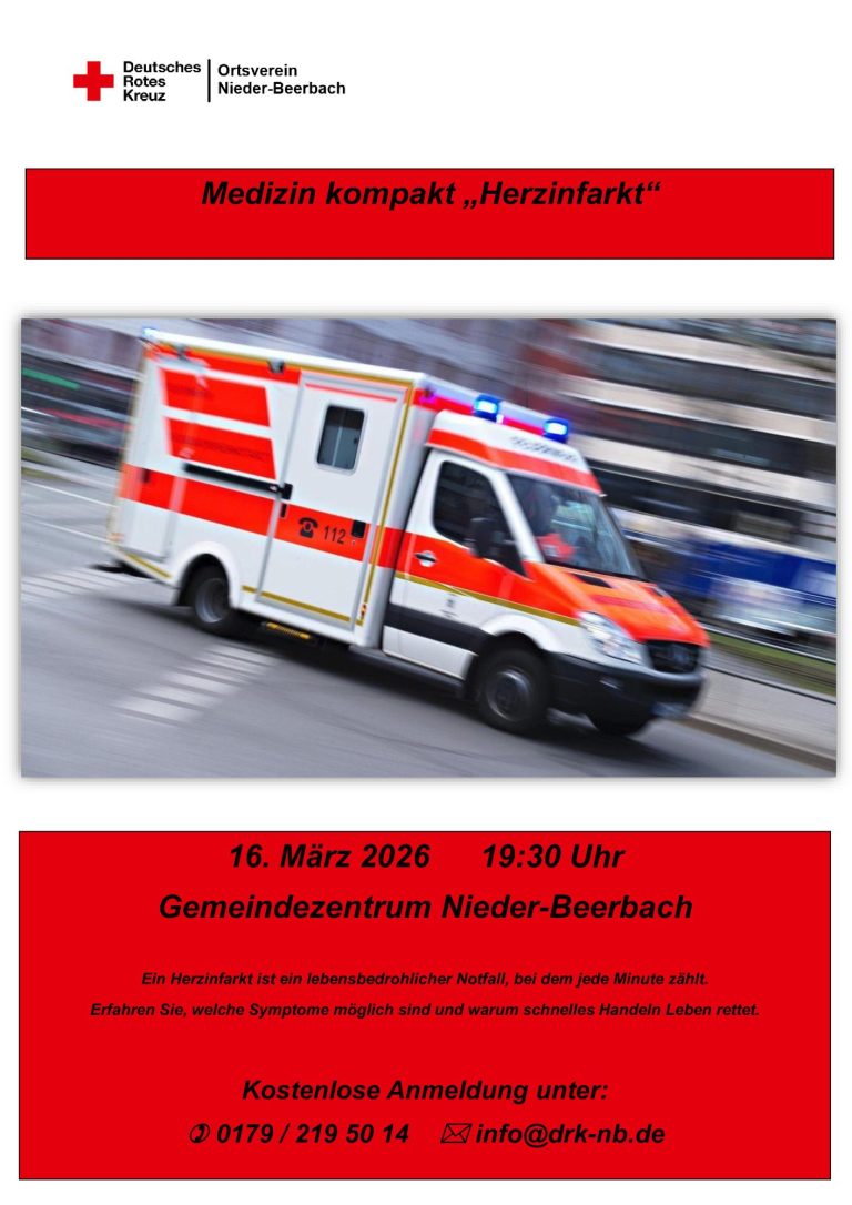 Die dritte Veranstaltung findet am 16. März 2026 um 19:30 Uhr im Untergeschoss des Gemeindezentrums in Nieder-Beerbach, mit dem Thema „Herzinfarkt“ statt.