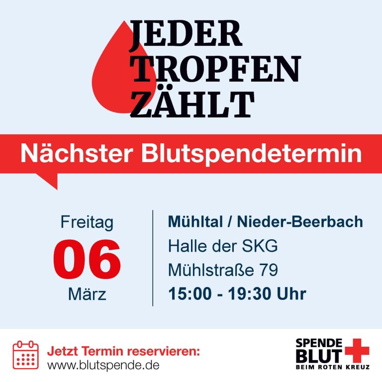 Der nächste Blutspendetermin findet am Freitag, den 6. März 2026 in der Zeit von 15:00 – 19:30 Uhr in der Halle der SKG Nieder-Beerbach statt.